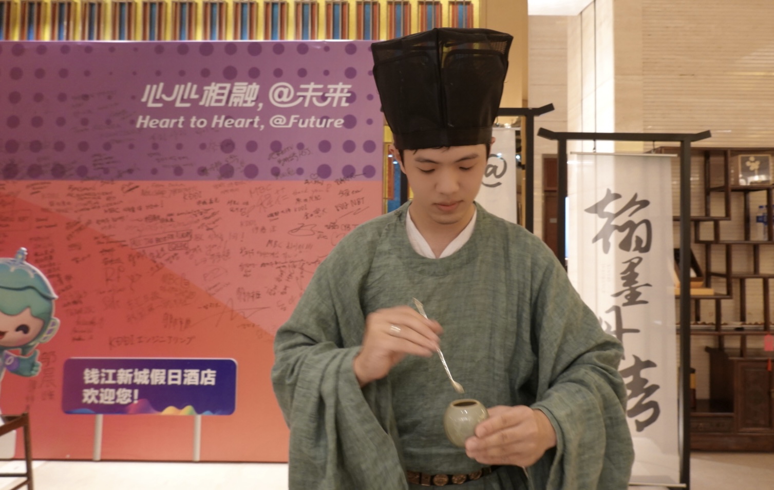据徐睿介绍,点茶起源于唐晚期,发展于五代,盛于两宋。点茶文化对当时周围国家茶文化发展产生深远影响。日本抹茶道就源于中国点茶。杭州作为南宋古都,复兴点茶文化刻不容缓。时至今日,已经有许多创新玩法,例如此次接待体验上的亚运会标志图,就是漏影春创新玩法的展示。