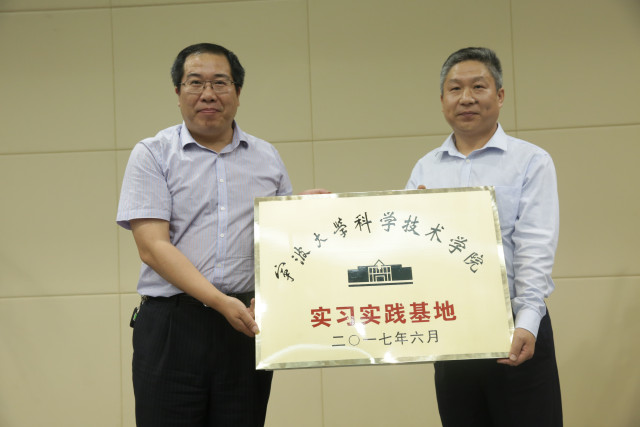 院党委副书记康棵飚向新海集团人事行政总监陈庆秋颁发实习实践基地铭牌。
