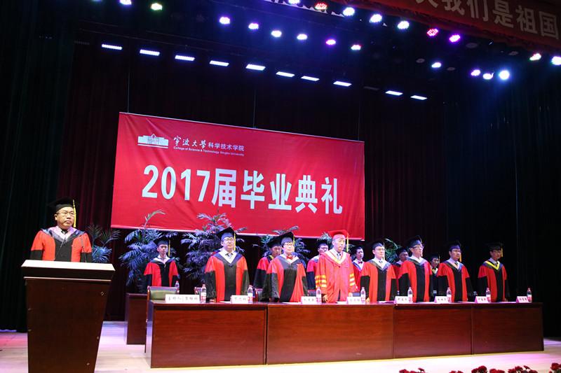 典礼于8点整正式开始。全体毕业生起立,奏唱国歌。典礼上,院党委书记邓建平宣读宁波大学科技学院2017届省级、院级优秀毕业生名单。随后,在《母亲》和《感恩的心》的歌声中,毕业生代表向家长代表、教师代表献花致谢。