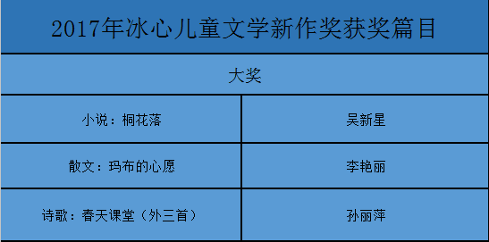 近日,2017年冰心儿童文学新作奖揭晓,我院09级汉语言文学专业校友吴新星凭借小说《桐花落》荣获新作奖大奖。据悉,此次共有37篇作品获得该奖项,其中大奖3篇,佳作奖34篇。