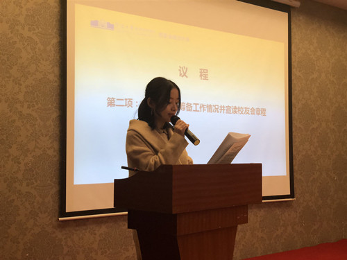 会议伊始,校友会常务理事赵裔依代表理事会(筹备)作校友会筹备工作介绍。据统计,嘉兴籍以及在嘉兴工作的校友遍布社会的各行各业,为社会建设做着自己的贡献。随后,赵裔依宣读了校友会章程,激励校友发扬母校“怀虚涵育,修己立人”的院训精神,践行“联络校友,团结互助,爱校荣校,建设嘉兴”的校友会宗旨,希望凭借校友们的力量为嘉兴及母校的发展增添光彩。