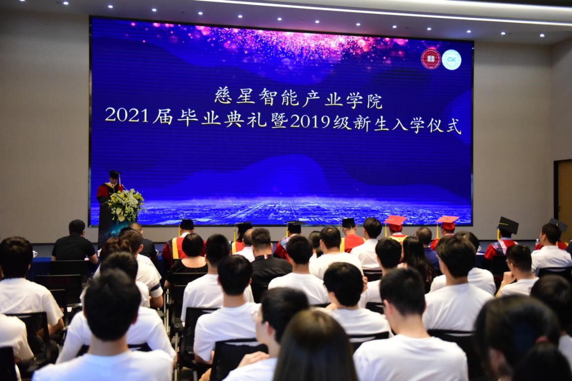 6月23日下午,慈星智能产业学院于环杭州湾智能产业园B楼4楼会议大厅举办2021届毕业典礼暨2019级新生入学仪式。学院院长陈君静、副院长朱世华、副院长罗思明、院务委员会副主任林雪明等领导,慈星股份有限公司董事长孙平范、副总经理李立军、副总经理徐卫东等企业导师嘉宾出席仪式;信息工程学院院长钟才明、党委书记林聪、副院长符强等信息工程学院、慈星智能产业学院领导及教师代表,慈星智能产业学院82位学生参加了本次仪式。仪式由慈星智能产业学院副院长吴振谦主持。