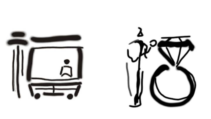 这几年,“扫五福”已经成为了过新年的“新风俗”,科院学子们也挥毫泼墨,写下或行或草的“爱国福”“友善福”,更有极具艺术设计感的写意“福”字。“我把福字变形,把公交车司机上班、求婚等平凡生活的场景融入,从平淡生活中找到幸福的感觉。”设计者方陈旺介绍道。