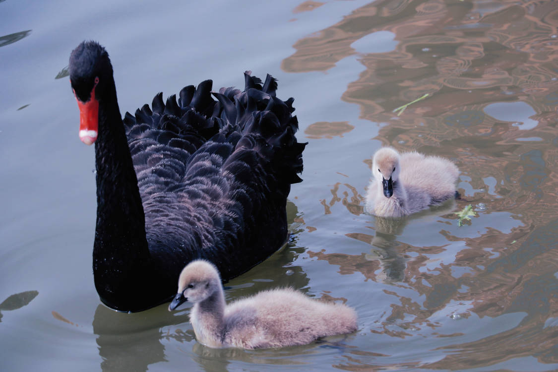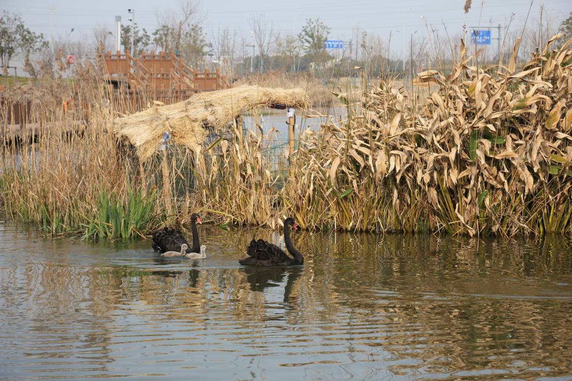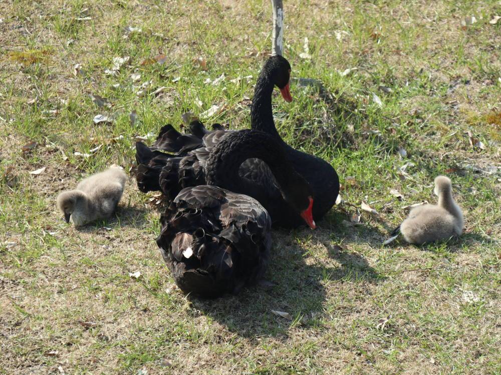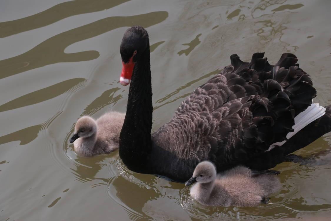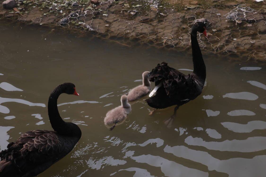 今天,记者在镜我湖畔看到,一对黑天鹅夫妇正带着两个宝宝在湖面上悠闲地浮水、晒太阳。毛茸茸的小家伙们紧紧地跟在父母后面,憨态可掬。