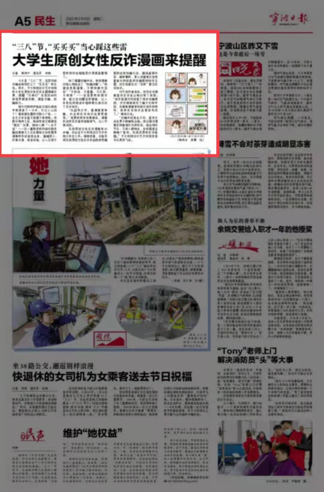 今天是“三八”节,各类网络诈骗也悄然盯上了“买买买”的女性。昨天,宁大科院设计艺术学院的大学生原创女性反诈主题漫画开展,提醒“女神们”在现实和网络世界擦亮双眼,提高识骗、防骗能力。