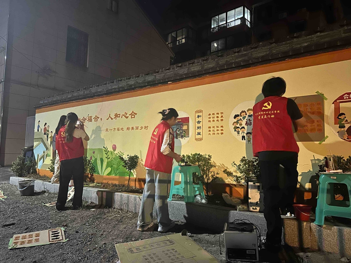 值得一提的是,团队还用画笔为乡村“梳妆”。盛夏酷暑让户外作画成了挑战,创作不得不在晚上进行。有人专注勾勒线条,笔尖在墙面游走时带起细微的粉尘;有人蹲在地上调和颜料,手腕反复搅动让色彩在桶中慢慢晕开。路灯昏黄的光晕洒在斑驳的墙面上,也勾勒出同学们俯身创作的身影。