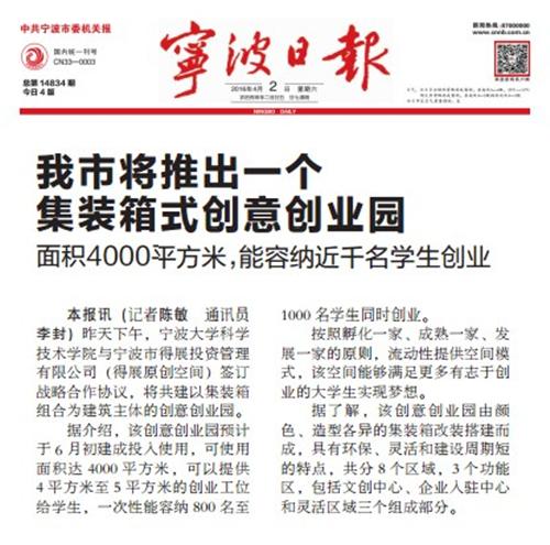 本报讯 昨天下午,宁波大学科学技术学院与宁波市得展投资管理有限公司(得展原创空间)签订战略合作协议,将共建以集装箱组合为建筑主体的创意创业园。