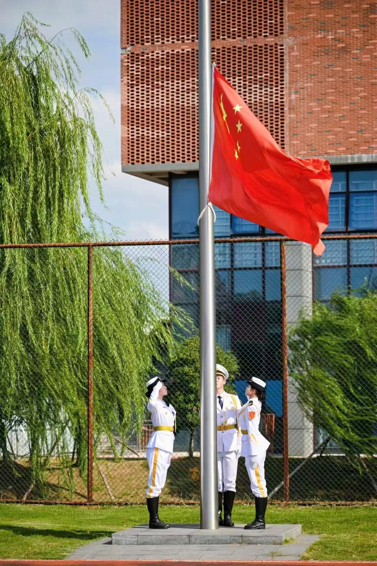 升旗仪式开始,全体师生肃立,向国旗行注目礼。