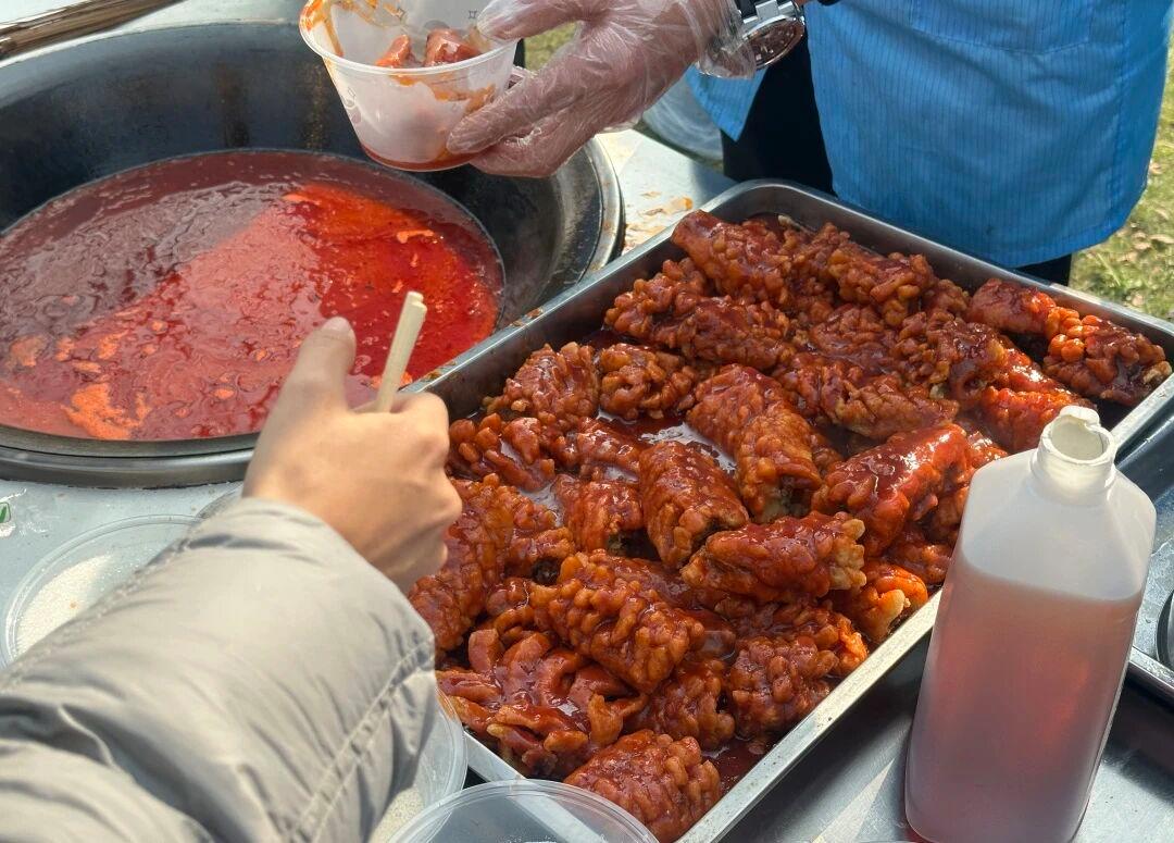 湖畔烹饪区香气蒸腾,鱼肉鲜嫩、牛羊醇香,搭配酸甜糖葫芦与各式精致甜点,琳琅美食次第登场。