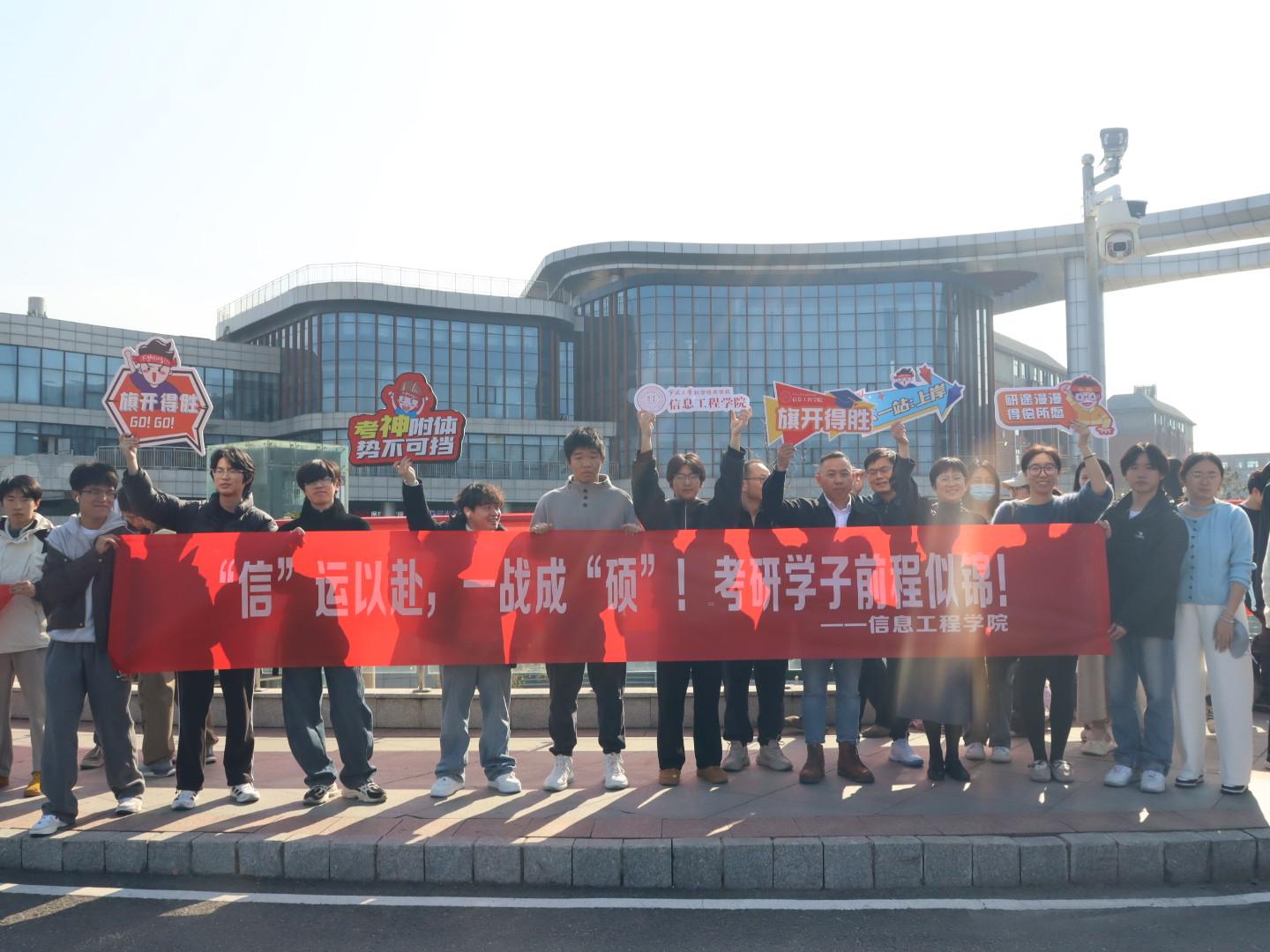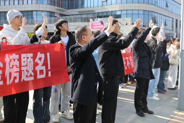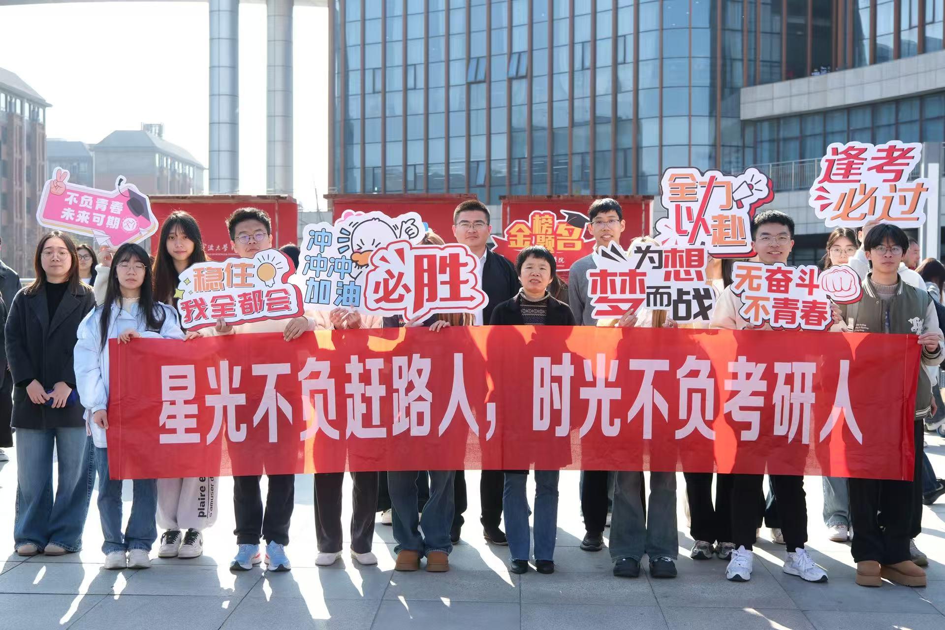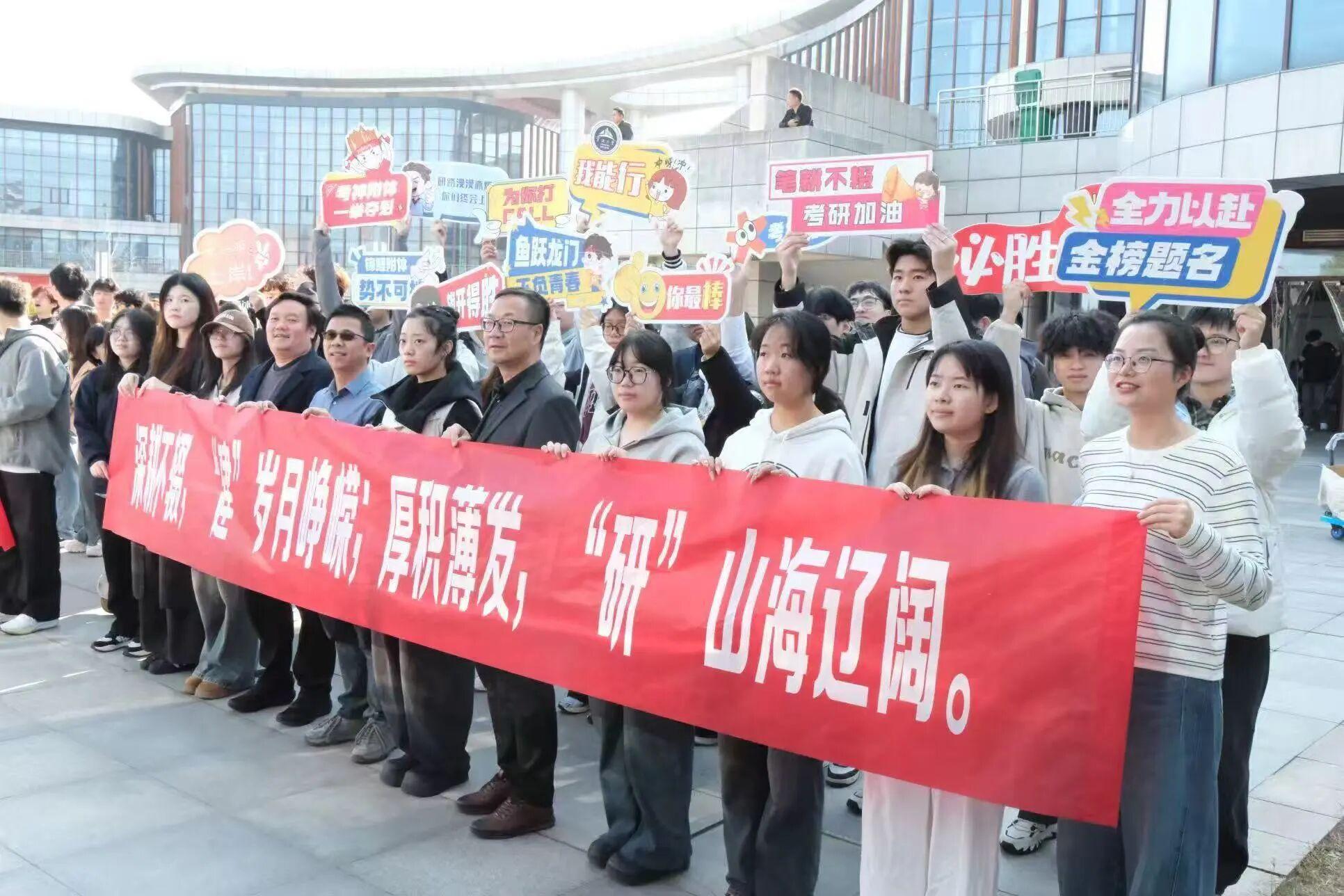 送考的师生们拉起横幅,举着手牌,送上考研福袋,祝愿考生们一战成“硕”。