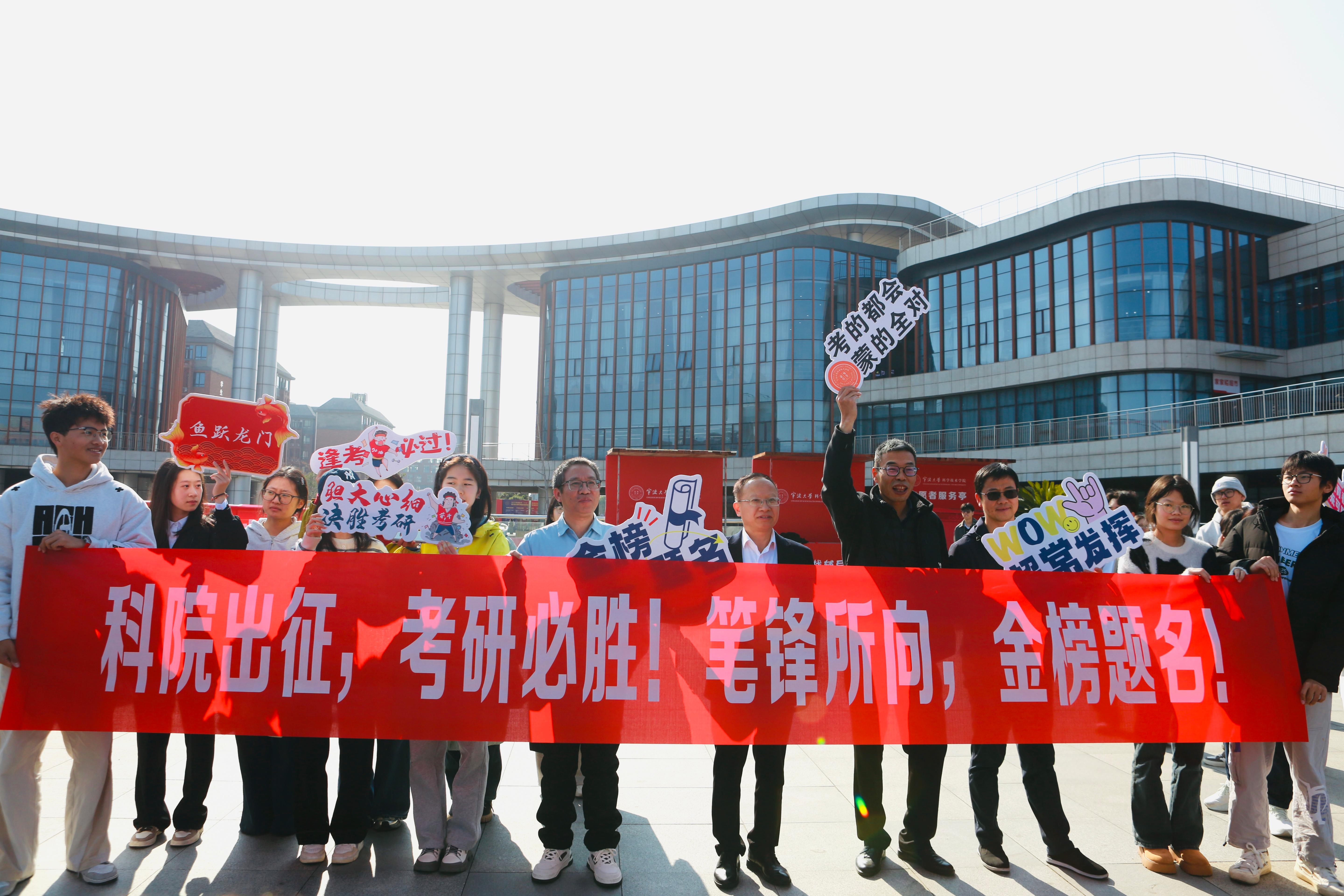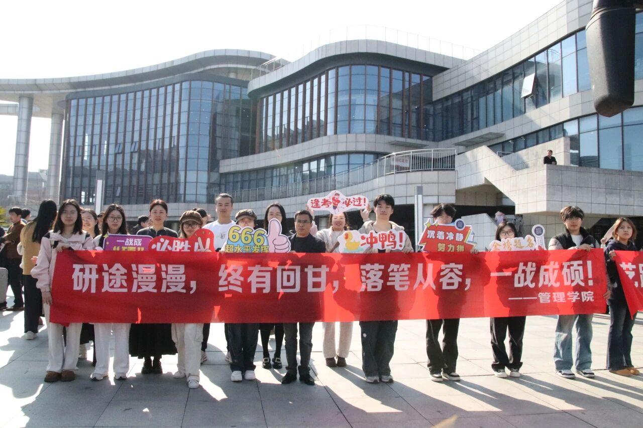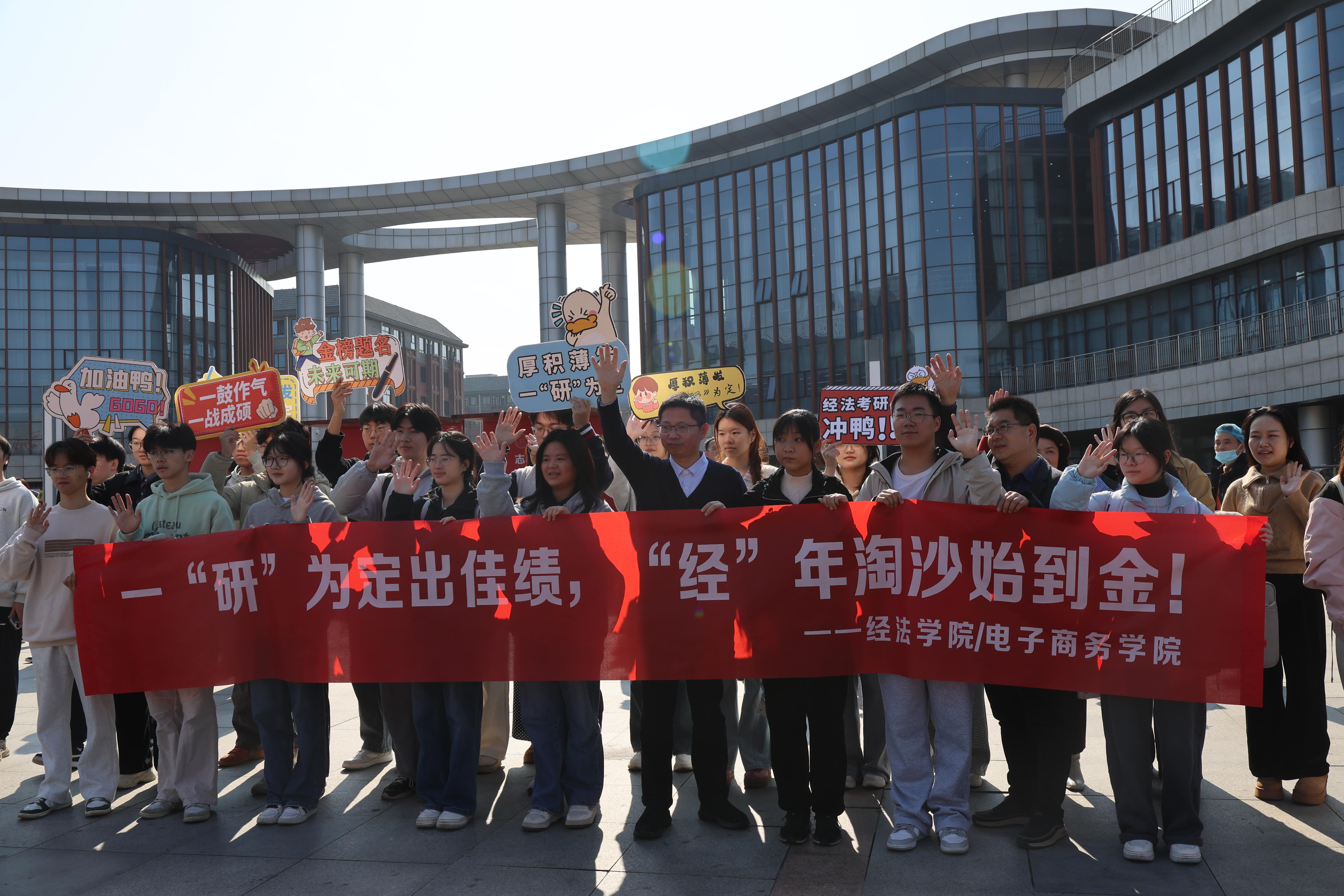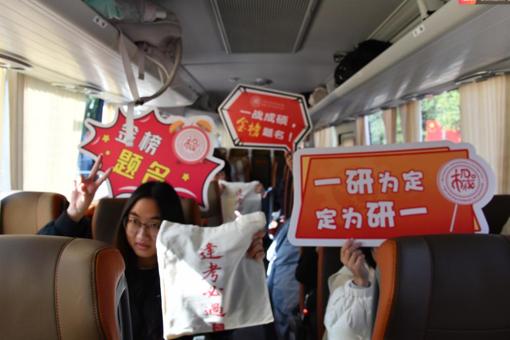 送考的师生们拉起横幅,举着手牌,送上考研福袋,祝愿考生们一战成“硕”。