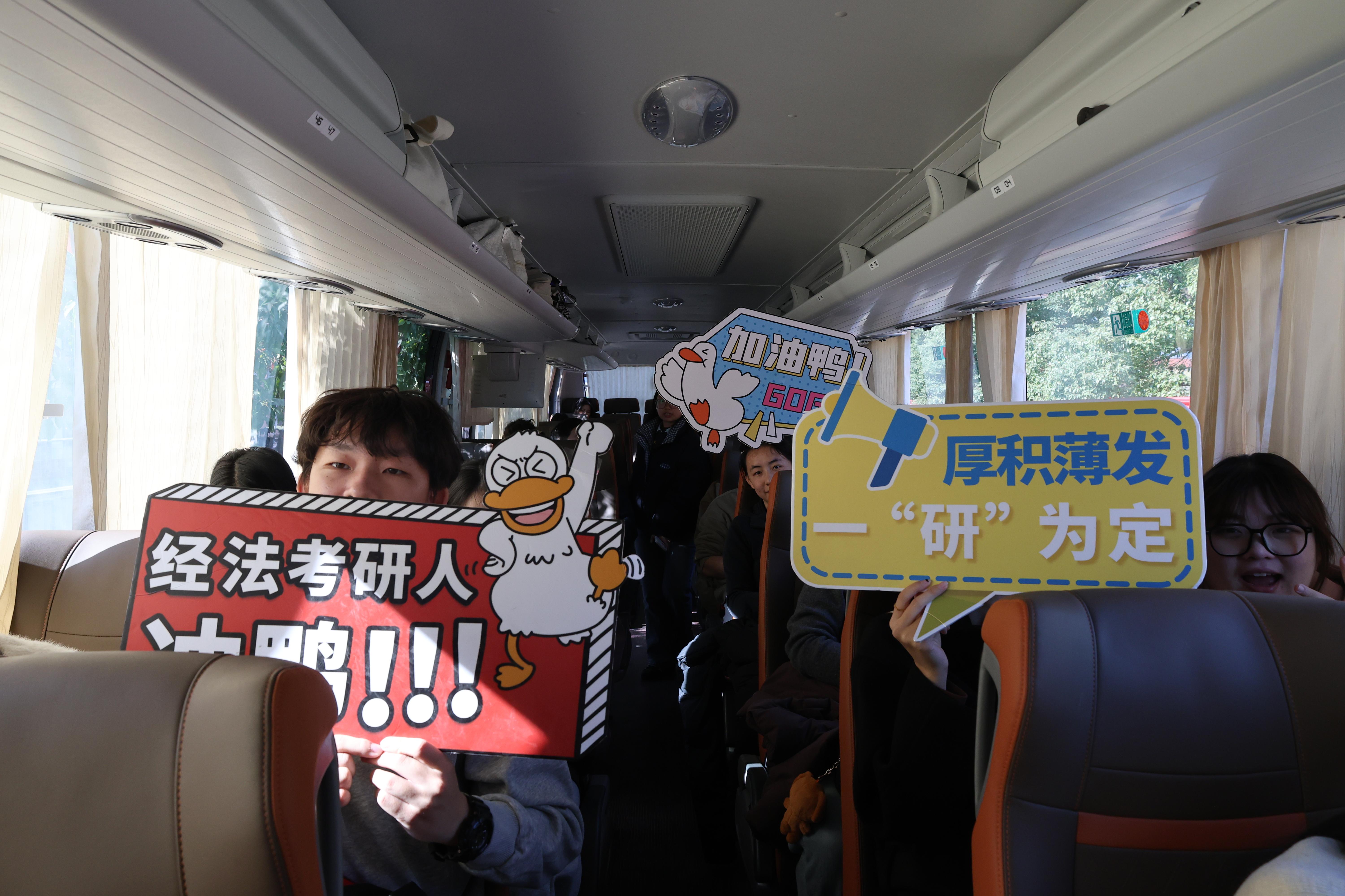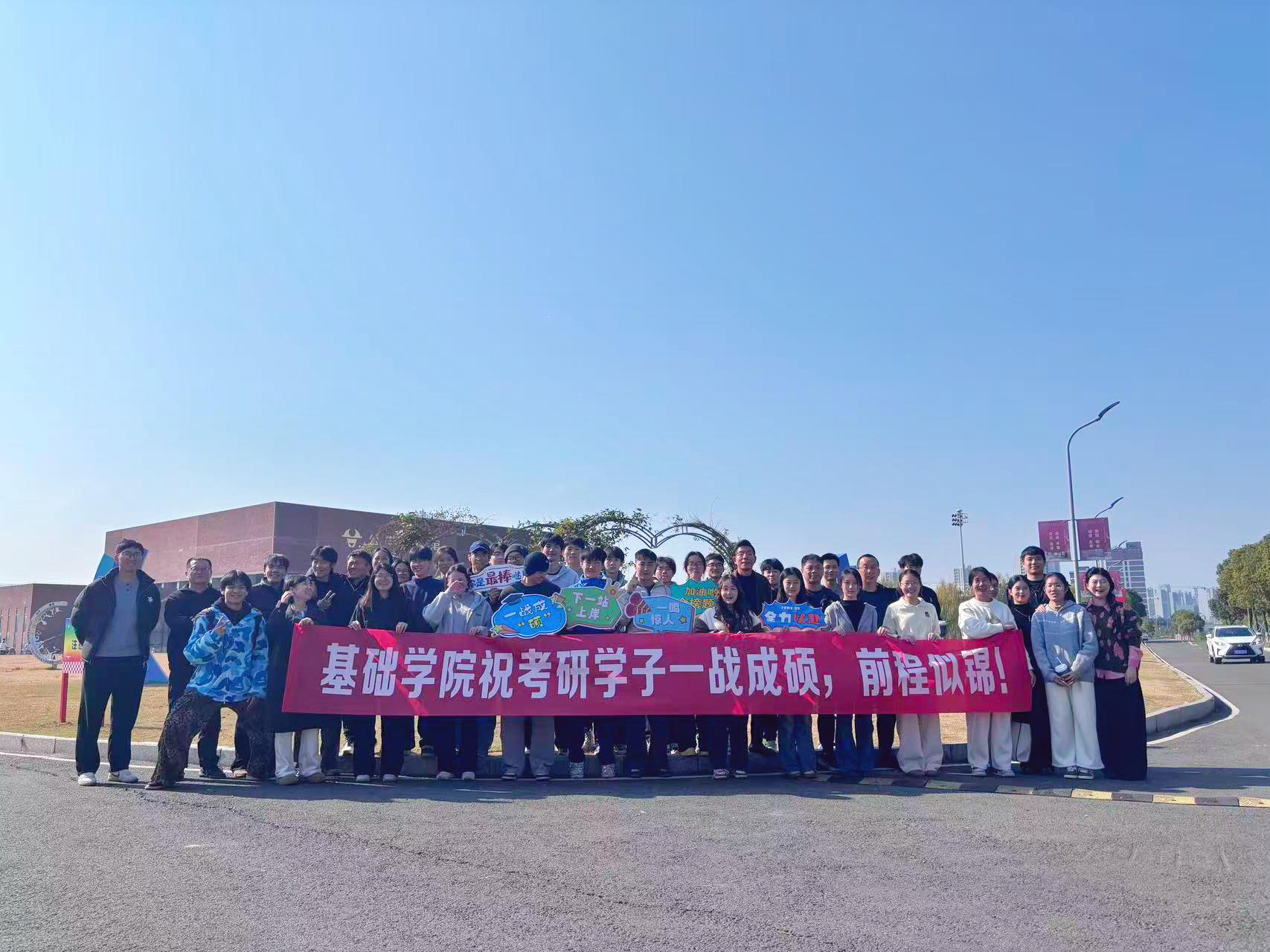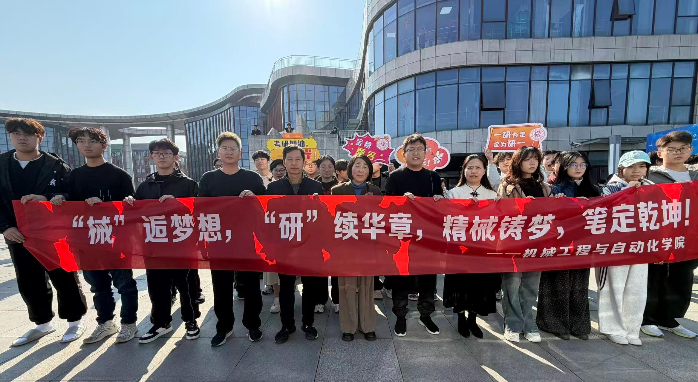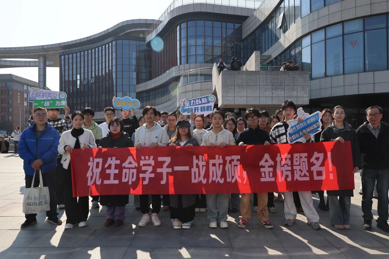 送考的师生们拉起横幅,举着手牌,送上考研福袋,祝愿考生们一战成“硕”。