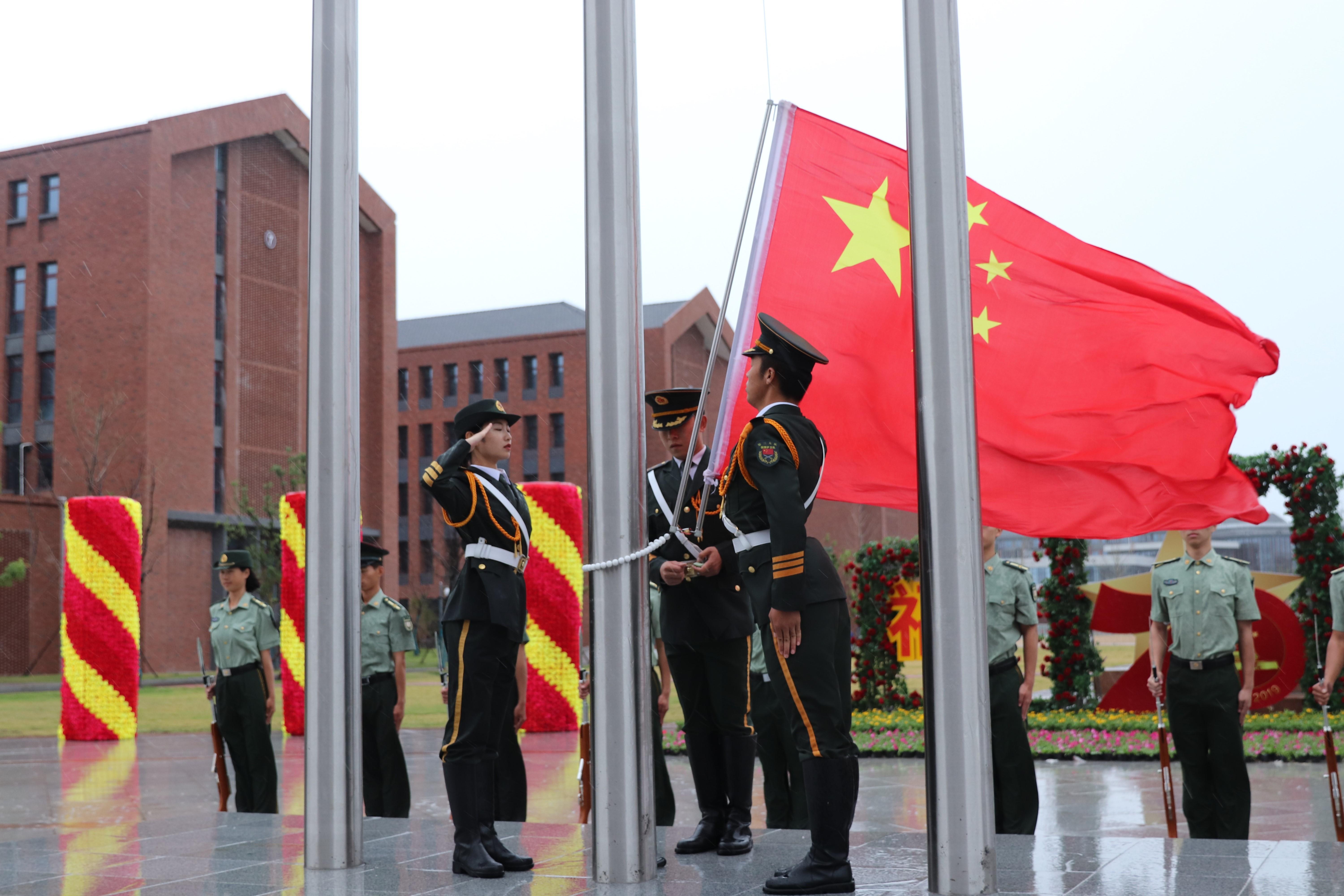 学院第三大队国旗护卫队步履铿锵地护送五星红旗至升旗台