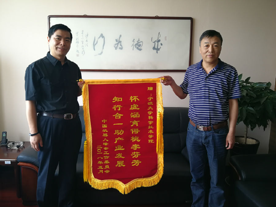 6月12日,中国机器人峰会联席秘书长张欢喜、副秘书长张建利一行来到我院,送来一面锦旗:“怀虚涵育得桃李芬芳,知行合一助产业发展”,对我院学生志愿者团队在上个月举办的第五届中国机器人峰会的工作予以感谢。